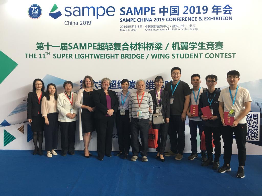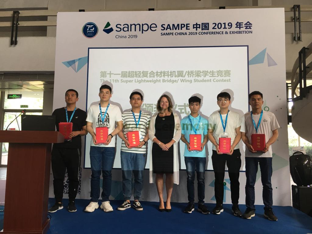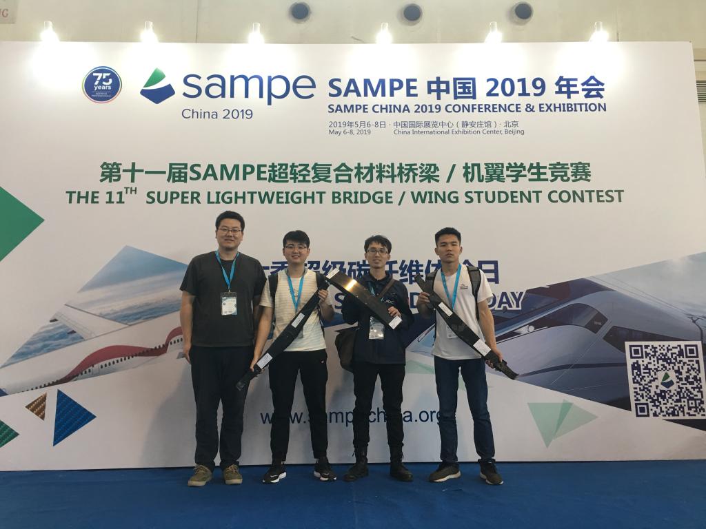 2019年5月6日至8日,由中国航空学会、SAMPE中国大陆总会共同主办,美国波音公司、中航复合材料有限责任公司赞助支持的第十一届SAMPE超轻复合材料机翼/桥梁学生竞赛在北京中国国际展览中心成功举办。今年会王飞、赵慧老师指导的三支代表队参加了比赛。