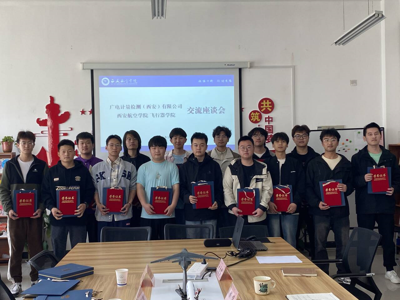 2025年1月,飞行器设计与工程专业15名学生赴蒲城机场完成为期4周的生产实习,本次实习为专业首次参与国内飞机试验科研项目。座谈会上,广电计量(西安)有限公司对今年会jinnianhuicom学生在实习工作过程中参加AG600降雪试验的表现表示充分的肯定,并对今年会jinnianhuicom给予的支持表示感谢。向学院赠送了“传道授业,育时代栋梁;校企携手,谱发展新篇“,并为参与试验的同学颁发证书。