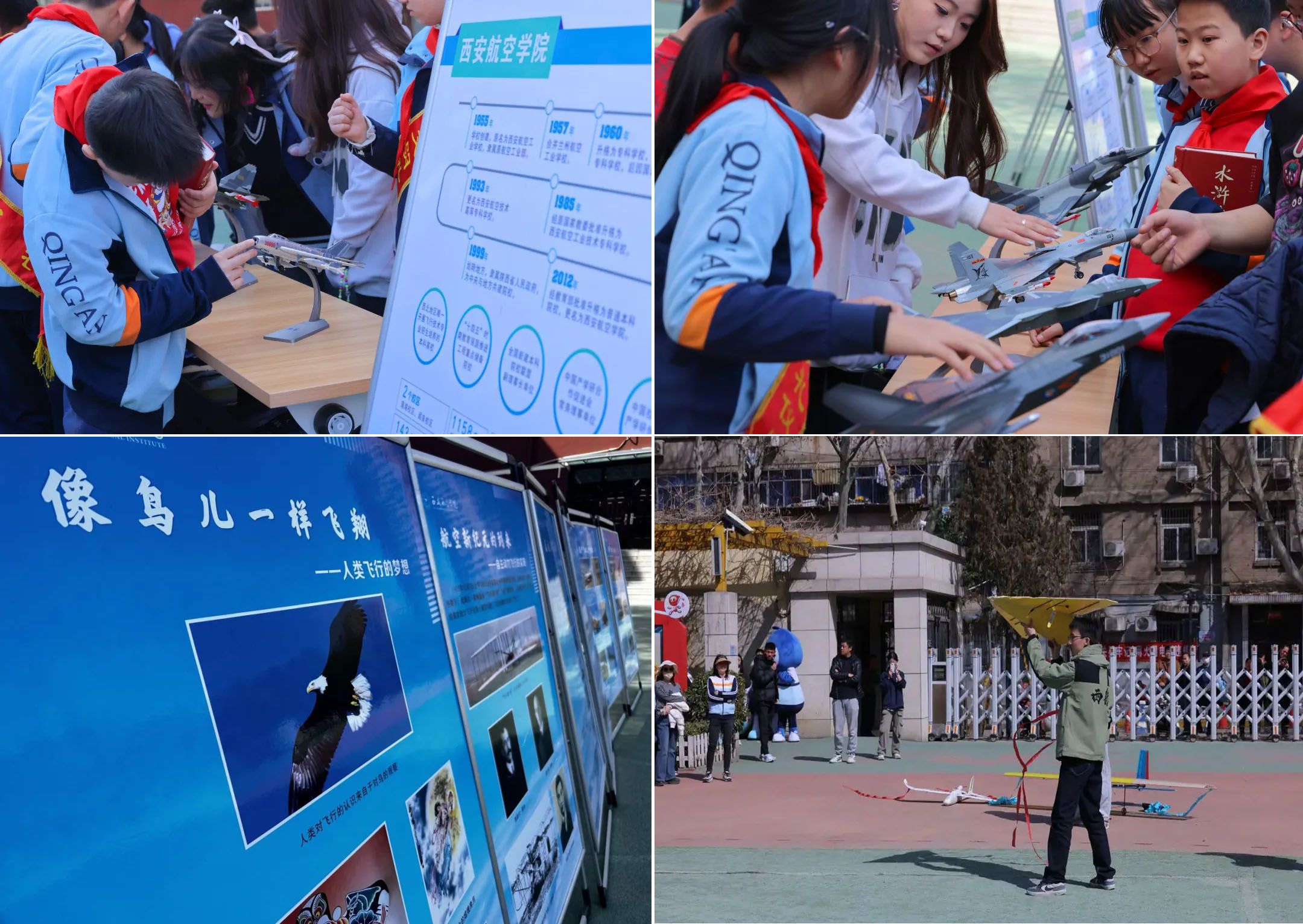 开幕式结束后,现场师生纷纷来到今年会布置的航空科普展位,在科普知识展板与静展飞机模型前驻足观赏、热情提问,西航学子报以专业、耐心的讲解,受到了庆安小学师生的一致好评,活动在欢乐融洽的氛围中落下帷幕。