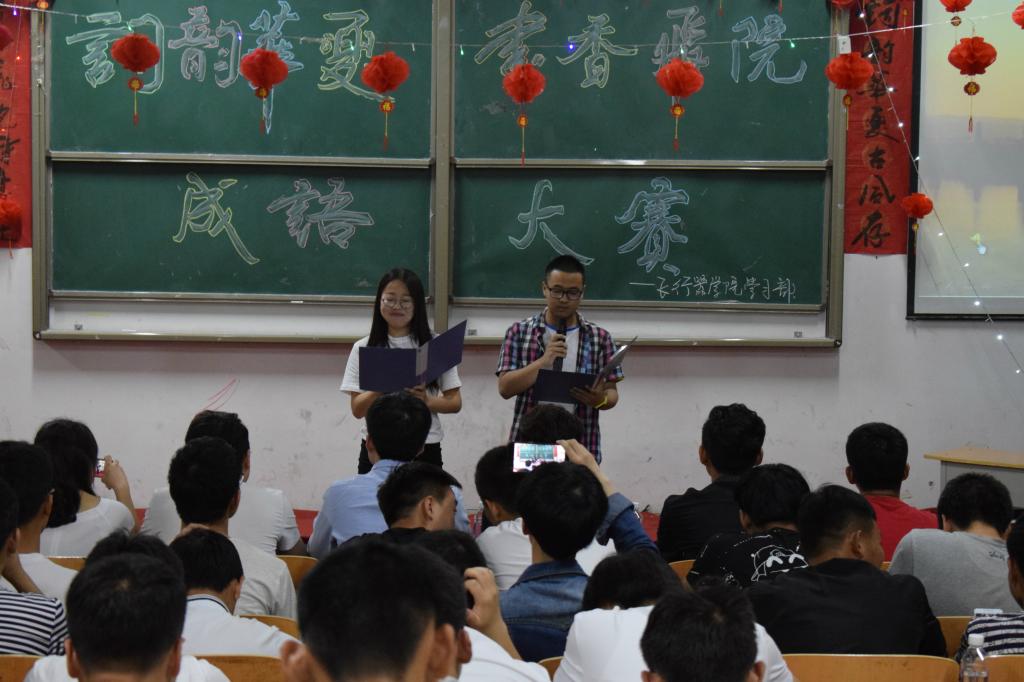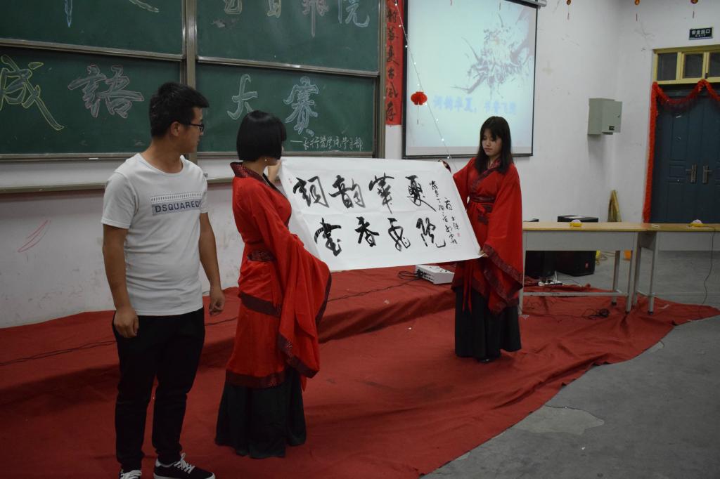 中华传统文化是中华民族实现民族振兴的力量源泉,是华夏儿女共同的精神财富,继承和弘扬中华传统文化是每一位青年大学生的光荣使命。为了弘扬中华传统文化,增强当代大学生的文化自豪感和自信心,5月18日晚,今年会在阎阶三成功举办“词韵华夏·书香飞院”成语大赛。校学生会、青联、汉服社等各大学生组织近200人到场观看了比赛。